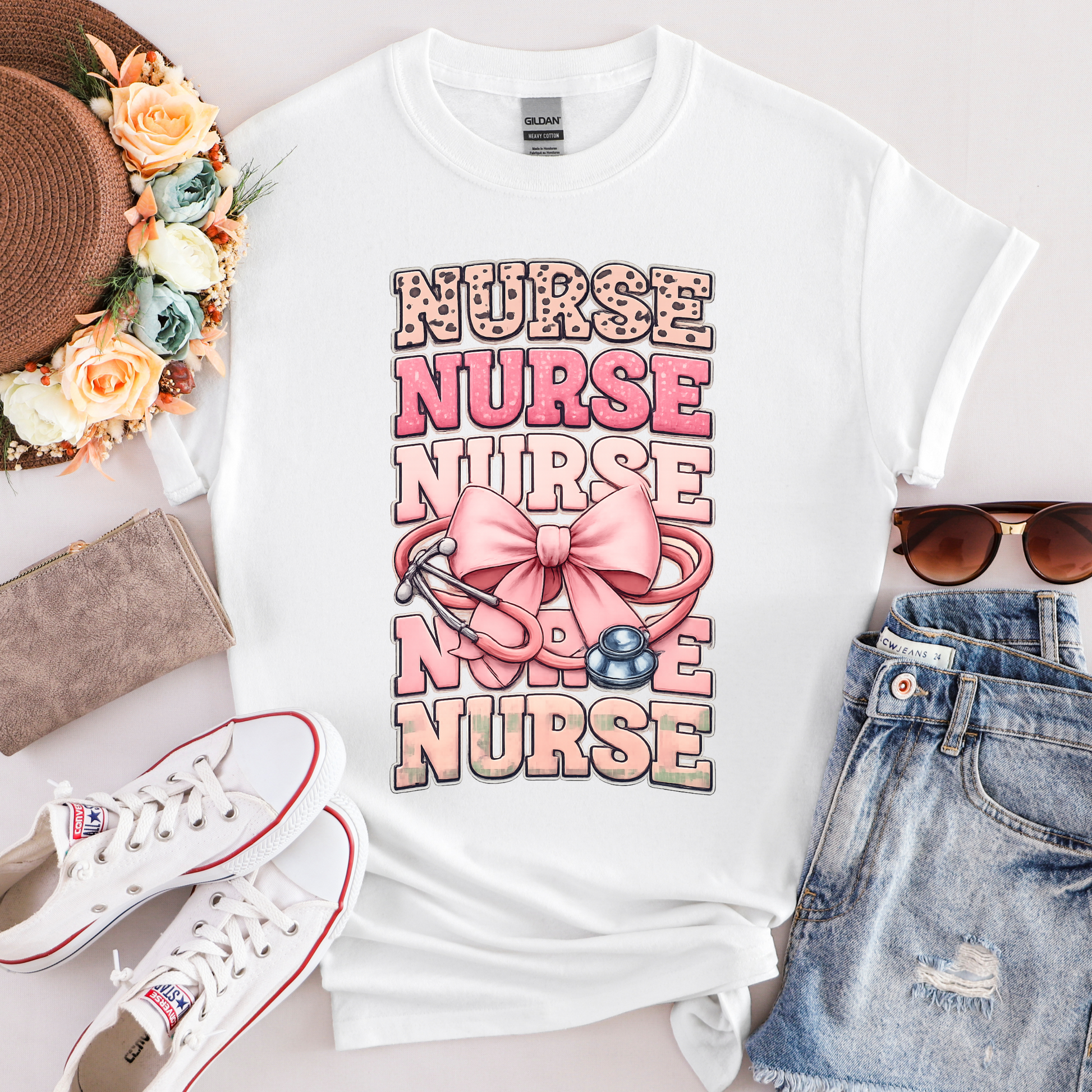 Faux Embroidery Nurse Stacked with Leopard and Pink