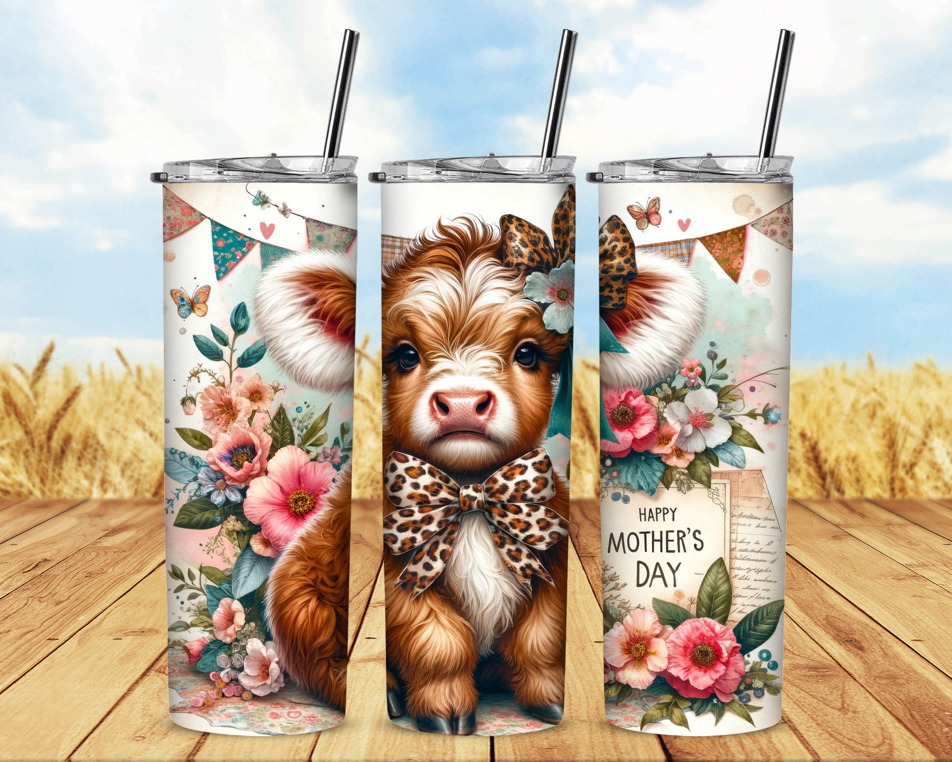 White and Brown Happy Mother's Day Highland Cow Tumbler